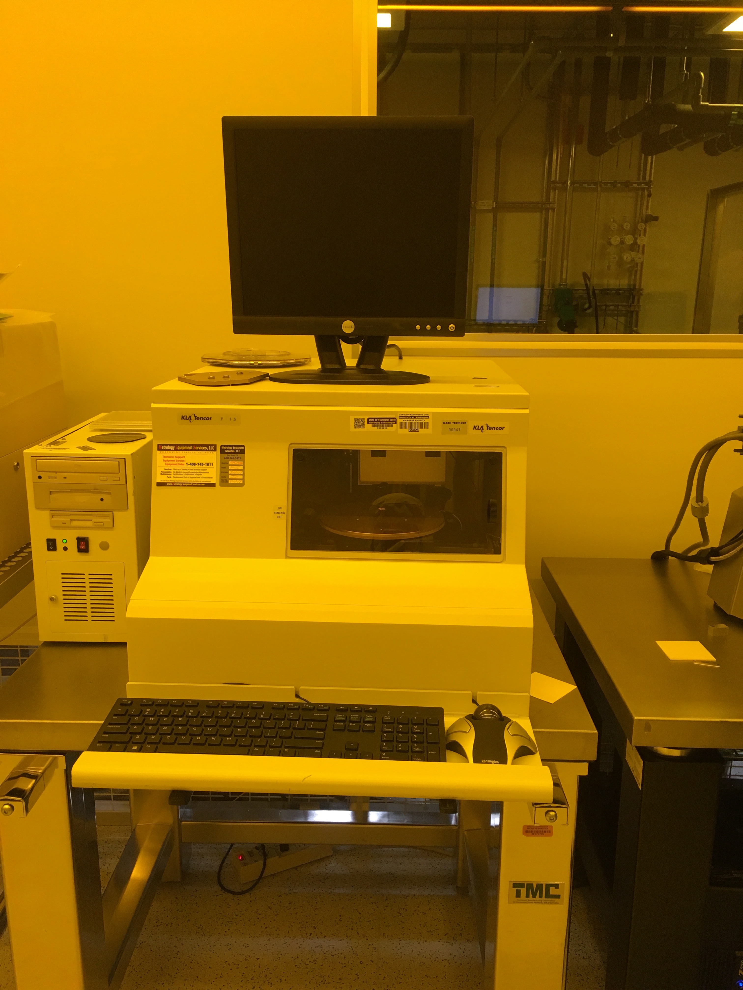 A surface profilometer for physical measurement of topography on wafers. Can program a sequence of locations to scan, providing 2-D and pseudo-3-D measurement of topography, as well as calculation of film stress. Step heights down to tens of nanometers are possible.